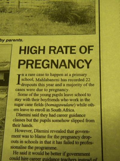 人口規模で言えば、スワジランドの人口は、日本では岩手県とか大分県あたりの規模です。 大分県で「2000人の中学校退学者が出て、うち600人が妊娠による退学」という状況を想像してみてください。 どの程度に衝撃的か、おわかりになるでしょう。